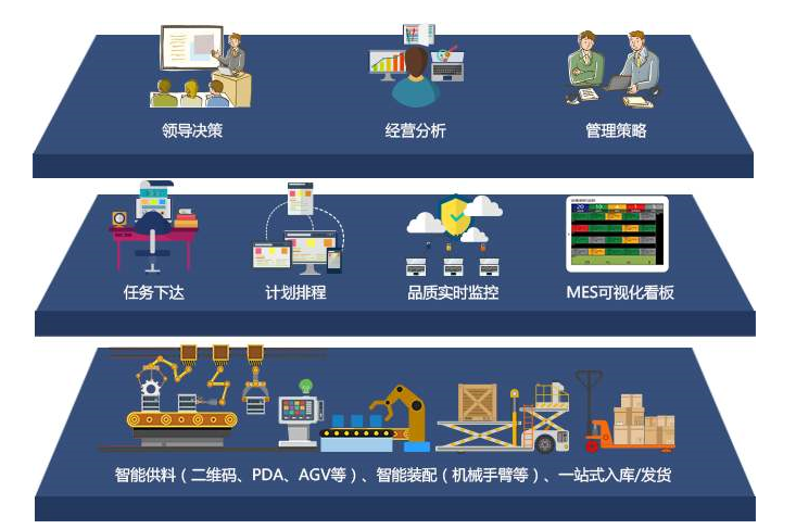 MES屬于ERP計(jì)劃層和車間層操作控制系統(tǒng)之間的執(zhí)行層,主要負(fù)責(zé)生產(chǎn)管理和調(diào)度執(zhí)行。它不單是面向生產(chǎn)現(xiàn)場的系統(tǒng),而是作為上、下兩個層次之間雙方信息的傳遞系統(tǒng),是連接現(xiàn)場層和經(jīng)營層,改善生產(chǎn)經(jīng)營效益的前沿系統(tǒng)。它提供了一個能夠集成諸如:訂單執(zhí)行與跟蹤、質(zhì)量控制、生產(chǎn)調(diào)度、物料投入產(chǎn)出管理等功能的的系統(tǒng)平臺,能夠?qū)崿F(xiàn)ERP系統(tǒng)無法實(shí)現(xiàn)的實(shí)時生產(chǎn)管理報表功能。